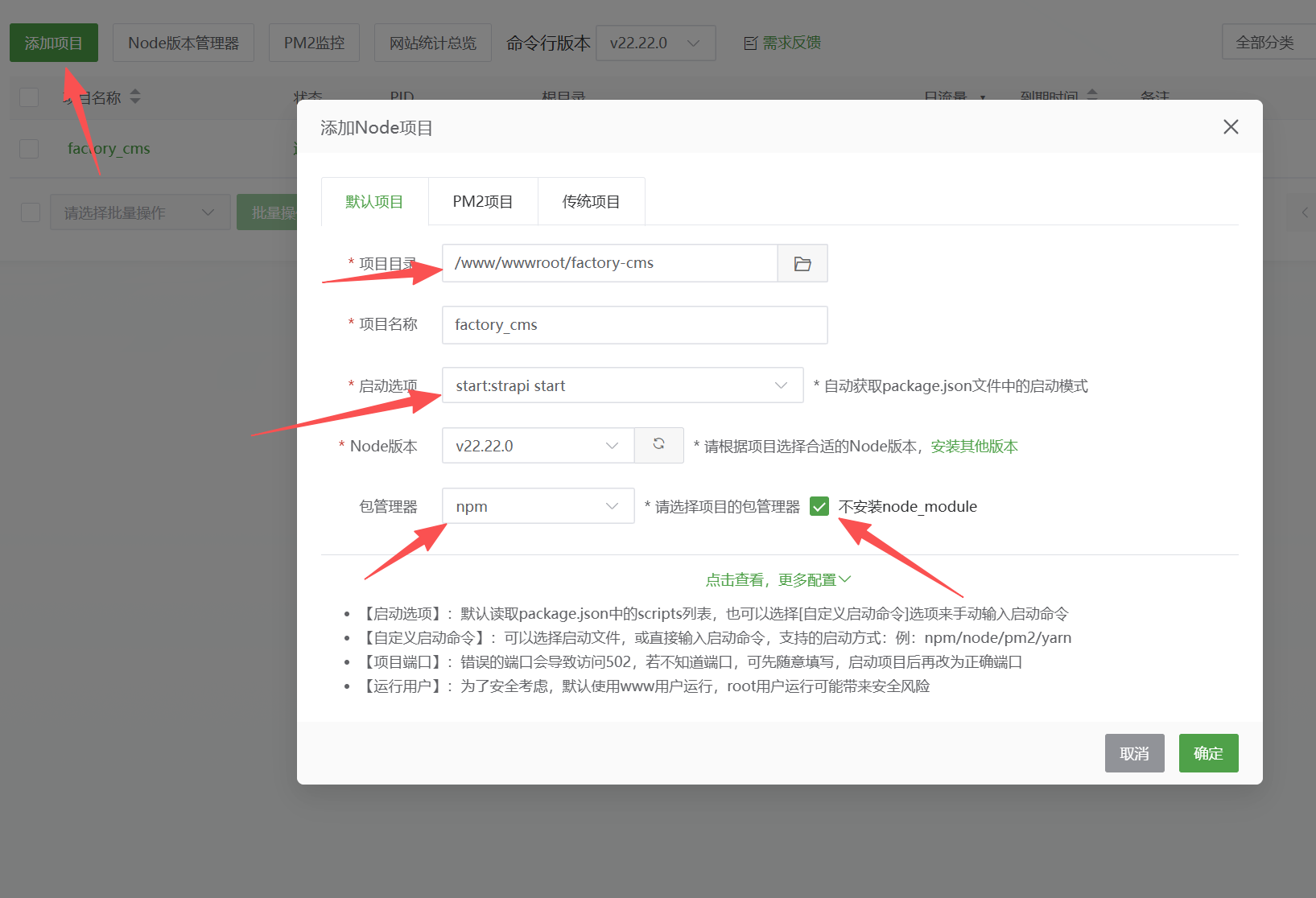 1.安装node.js ,我这里安装的是v22.22.0版本 2.创建数据库 3. 点击宝塔面板里的终端执行以下命令//进入wwwroot文件夹cd /www/wwwroot//测试npm是否安装成功,如果出现版本号就说明npm安装没问题npm -v//执行安装命令,factory-cms为自定义的项目文件夹名称npm create strapi@latest factory-...
