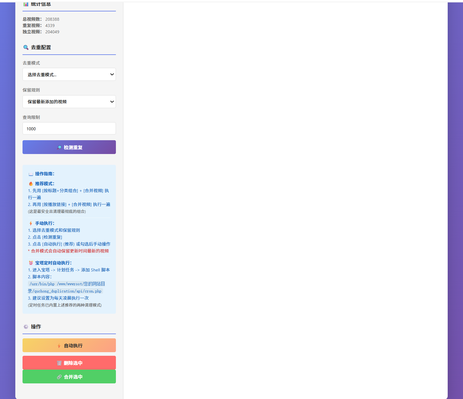 ## ✨ 核心功能### 7种去重模式1. **按标题完全匹配** - 精确查找完全相同的标题2. **按标题模糊匹配** - 模糊查找相似标题3. **按播放链接** - 相同播放源视频4. **按内容哈希值** - 基于标题和播放链接生成的哈希值5. **按标题+演员组合** - 组合条件精准匹配6. **按标题+年代组合** - 同一时期的相同标题7. **按标题+分类组合** - 同一分类...